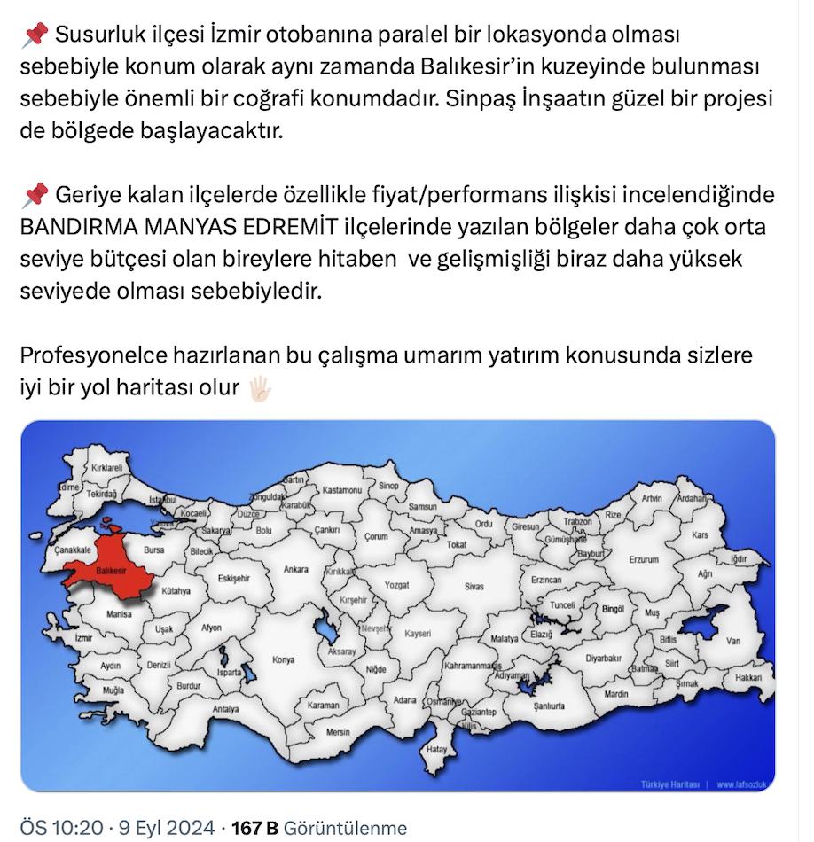 Gayrimenkul Uzmanı Murat Gültekin resmi sosyal medya hesabı üzerinden yaptığı paylaşımda Ege ve Marmara bölgesinin en çok gelişecek şehri Balıkesir’de arazi yatırımı için fırsat bölgeleri açıkladı.