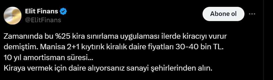 https://x.com/ElitFinans X sosyal medya hesabından yaptığı paylaşımda, yüzde 25 sınırlamanıın ileride kiracıları vuracağını söylediğini belirterek şunları söyledi: