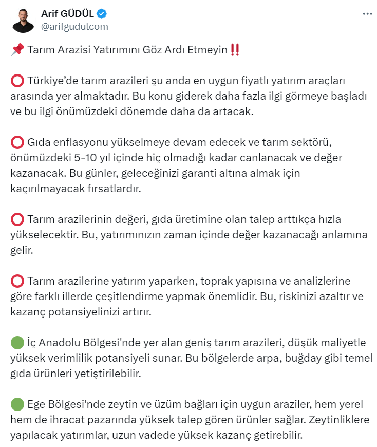 Arif Güdül paylaşımında "Türkiye’de tarım arazileri şu anda en uygun fiyatlı yatırım araçları arasında yer almaktadır. Bu konu giderek daha fazla ilgi görmeye başladı ve bu ilgi önümüzdeki dönemde daha da artacak." ifadelerini kullandı.