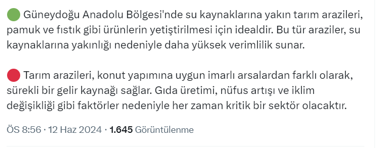 -Güneydoğu Anadolu Bölgesi'nde su kaynaklarına yakın tarım arazileri, pamuk ve fıstık gibi ürünlerin yetiştirilmesi için idealdir. Bu tür araziler, su kaynaklarına yakınlığı nedeniyle daha yüksek verimlilik sunar.