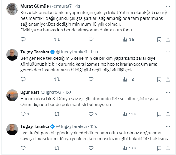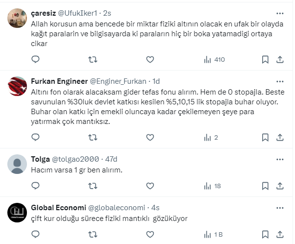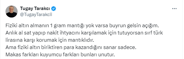 Finans danışmanı Tugay Tarakçı, https://twitter.com/TugayTarakcii X sosyal medya hesabından altın yatırımı yapmak isteyenlerle kendi tavsiyelerini paylaştı. İşte o paylaşım: