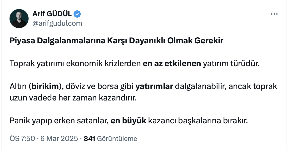 Arsa ve arazi yatırımlarının yıldızının her geçen gün daha da parladığı bu dönemde, Toprak Yatırımcısı ve talepbul'un Yönetim Kurulu Başkanı Arif Güdül’den de toprak yatırımları ile ilgili yine çok konuşulacaki bir paylaşım geldi.