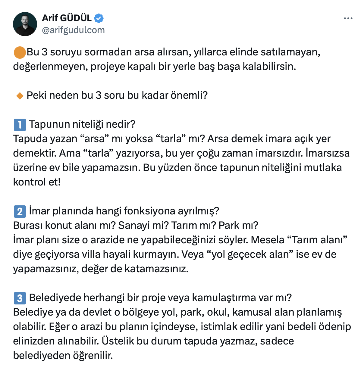 Arif Güdül resmi sosyal medya hesabı https://twitter.com/arifgudulcom üzerinden yaptığı paylaşımda arsa yatırımı yapmadan sorulması gereken 3 soruyu açıkladı.