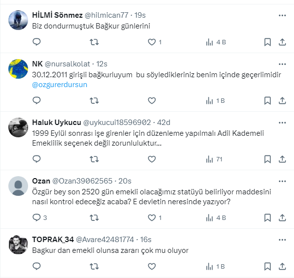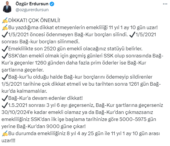 Erdursun https://x.com/ozgurerdursun X sosyal medya hesabından yaptığı paylaşımda, “1 Mayıs 2021 tarihinde yapılan değişikliklere dikkat çekerek, bu tarihe dikkat etmeyenlerin emekliliğinin 11 yıl 1 ay 10 gün uzayacağını söyledi.