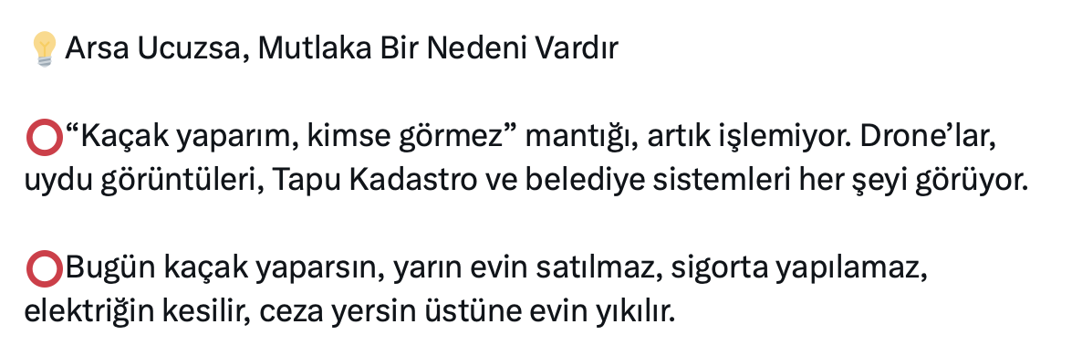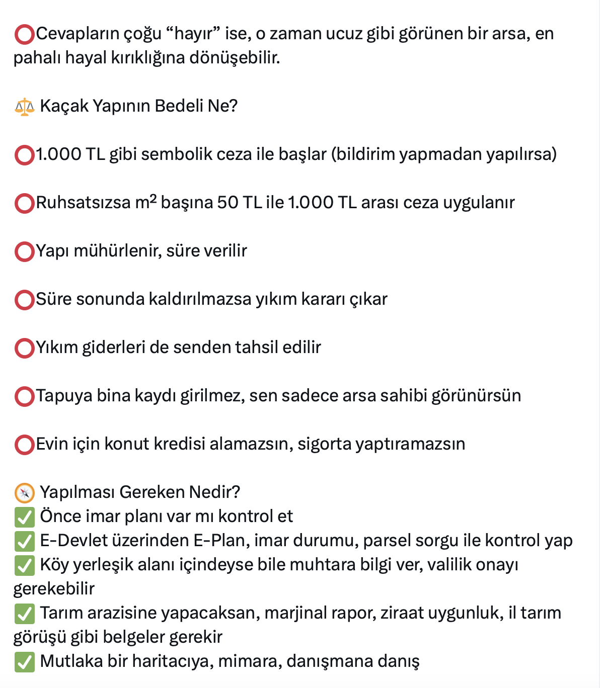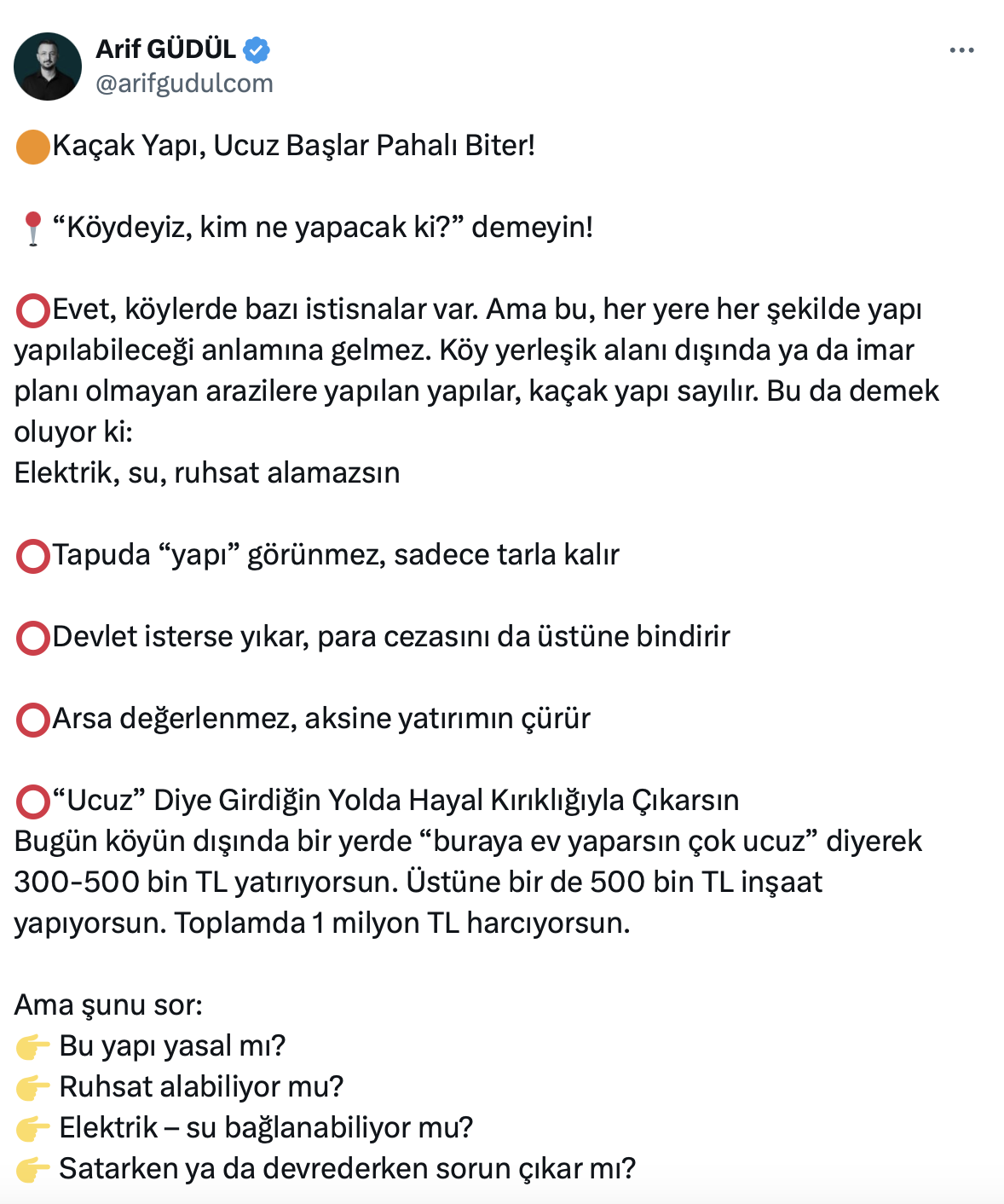 Toprak Yatırımcısı ve talepbul'un Yönetim Kurulu Başkanı Arif Güdül resmi sosyal medya hesabı üzerinden yaptığı paylaşımda önemli bir uyarı yaparak, “Kaçak yapı, ucuz başlar pahalı biter” dedi.