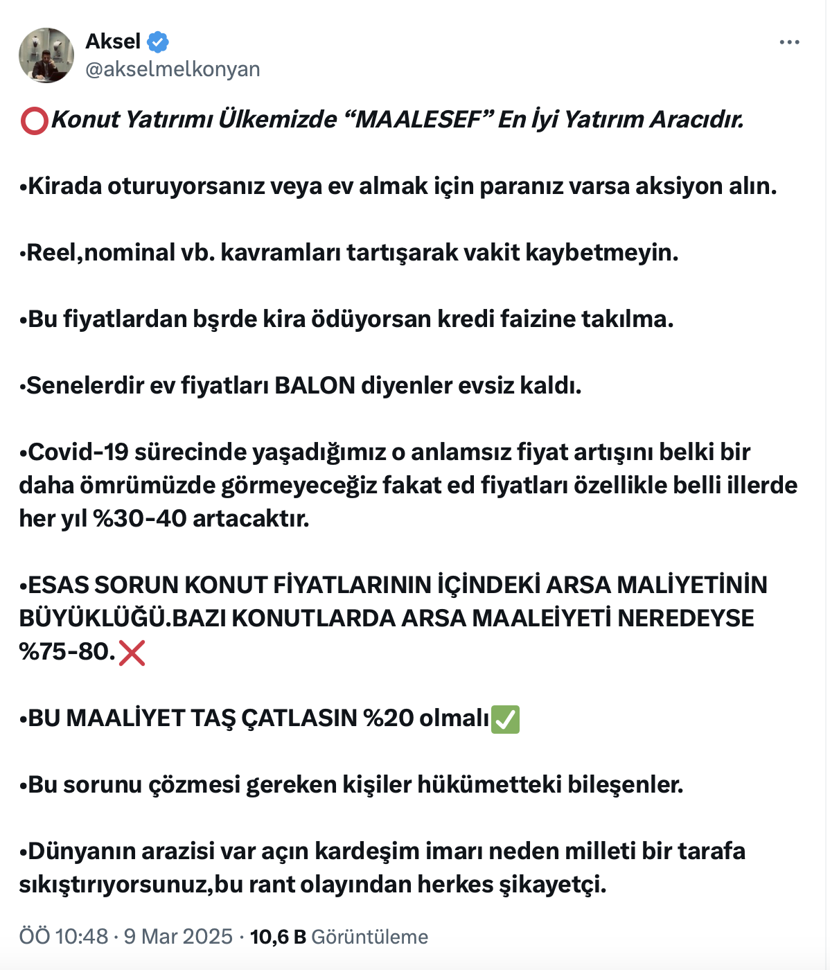 Aksel Melkonyan paylaşımında şu ifadeleri kullandı: “Konut yatırımı ülkemizde “maalesef” en iyi yatırım aracıdır. Kirada oturuyorsanız veya ev almak için paranız varsa aksiyon alın. Reel,nominal vb. kavramları tartışarak vakit kaybetmeyin. Bu fiyatlardan birde kira ödüyorsan kredi faizine takılma. Senelerdir ev fiyatları balon diyenler evsiz kaldı.