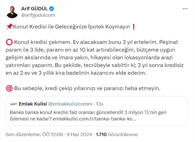 Toprak Yatırımcısı ve talepbul'un Yönetim Kurulu Başkanı Arif Güdül, resmi X hesabı https://x.com/arifgudulcom üzerinden yaptığı paylaşımda konut kredisi ile geleceğinize ipotek koymayın uyarısı yaptı.