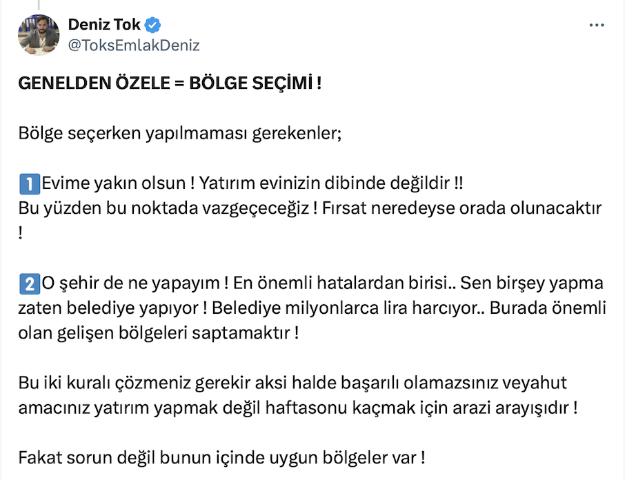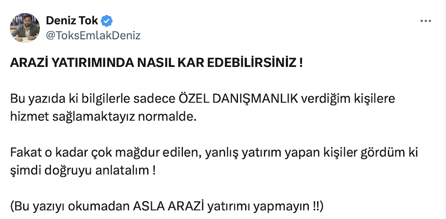 Arsa ve arazi yatırımlarının revaçta olduğu şu günlerde Tok’s Emlak ve D.T İnşaat Kurucusu Deniz Tok da arazi yatırımında nasıl kar edilebileceğini açıkladı.