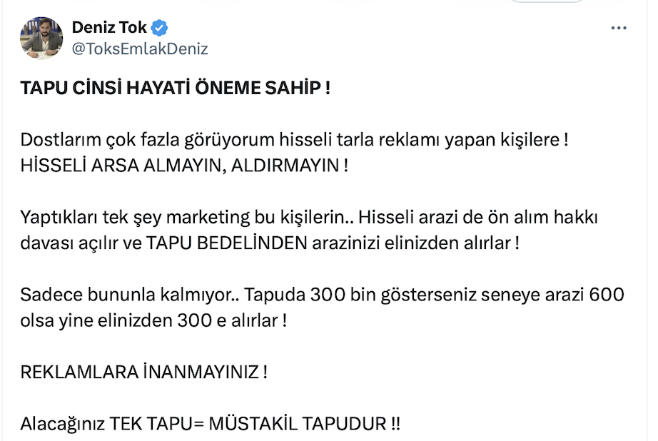Dostlarım çok fazla görüyorum hisseli tarla reklamı yapan kişilere ! HİSSELİ ARSA ALMAYIN, ALDIRMAYIN !