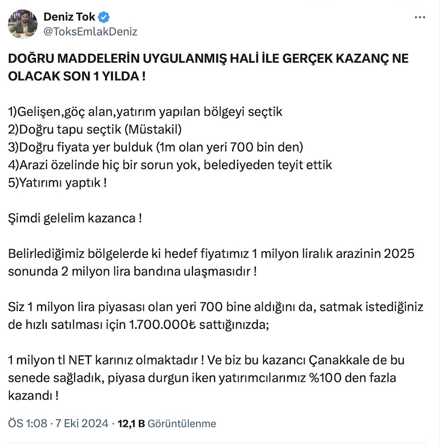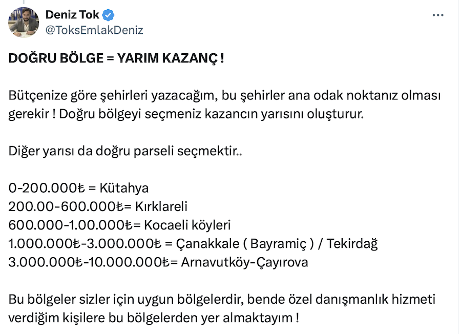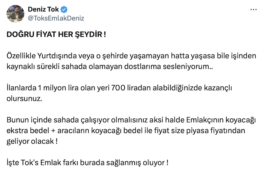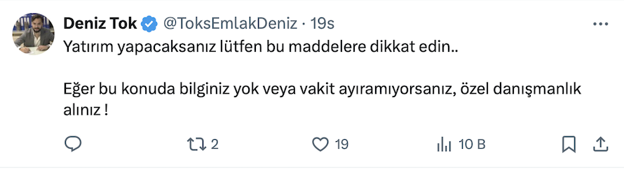 Tok’s Emlak ve D.T İnşaat Kurucusu Deniz Tok da resmi sosyal medya hesabı https://x.com/ToksEmlakDeniz üzerinden yaptığı paylaşımda konut için zamanın daraldığını belirterek, “Konut alabiliyorsanız mutlaka alın” dedi.