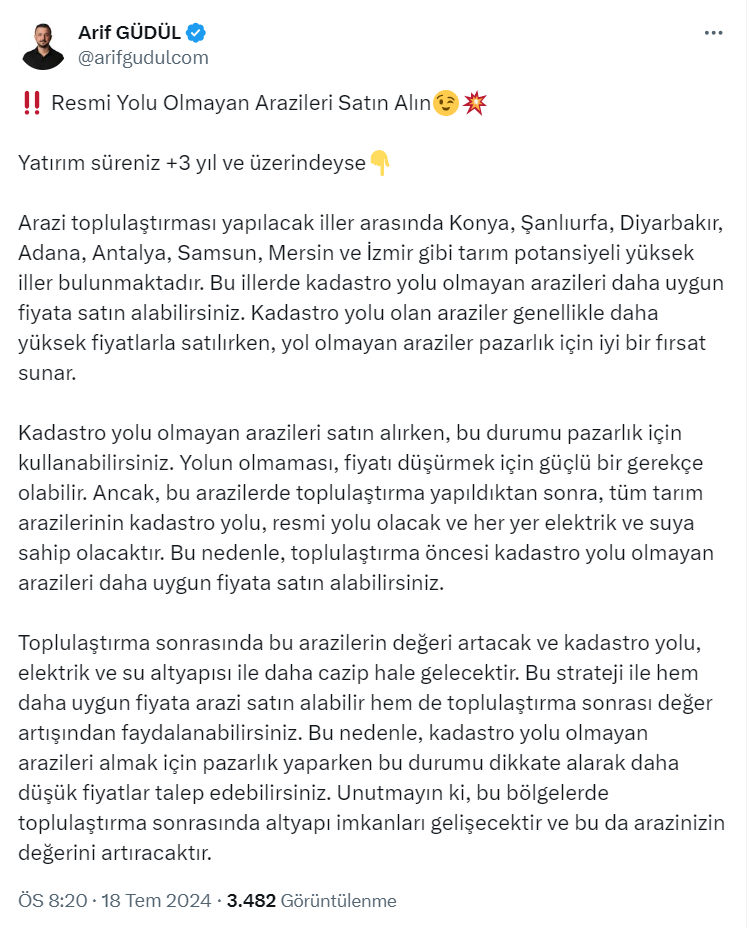 Toprak Yatırımcısı ve talepbul'un Yönetim Kurulu Başkanı Arif Güdül paylaşımında "Resmi yolu olmayan arazileri satın alın" ifadelerini kullandı.