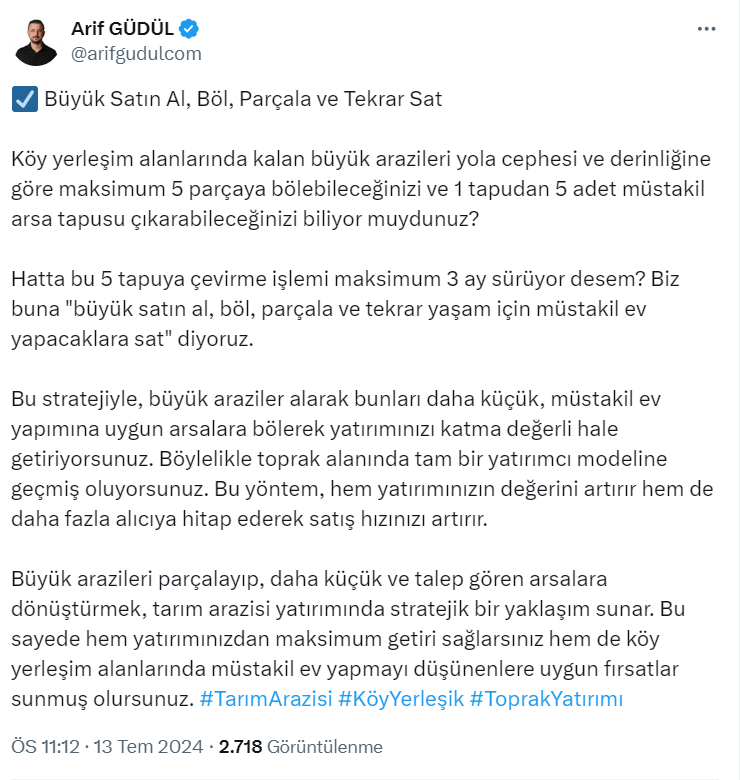 Arif Güdül paylaşımında arazi yatırımcılarına çok önemli bir tavsiye vererek, "Büyük satın al, böl, parçala ve tekrar sat" ifadelerini kullandı.