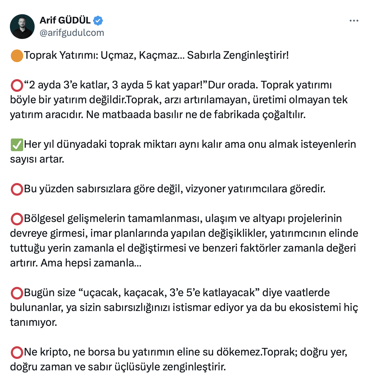 Arif Güdül resmi sosyal medya hesabı https://twitter.com/arifgudulcom üzerinden yaptığı paylaşımda arsa ve arazi yatırımının sabırla zenginleştireceğini söyledi.