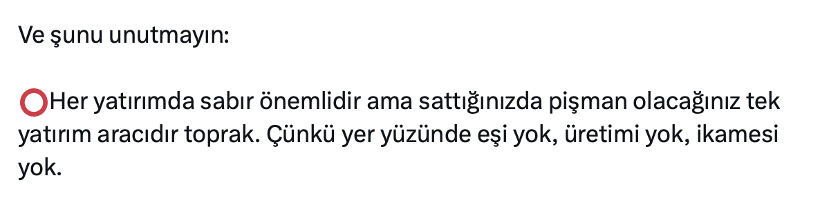 “2 ayda 3’e katlar, 3 ayda 5 kat yapar!”Dur orada. Toprak yatırımı böyle bir yatırım değildir.Toprak, arzı artırılamayan, üretimi olmayan tek yatırım aracıdır. Ne matbaada basılır ne de fabrikada çoğaltılır.
