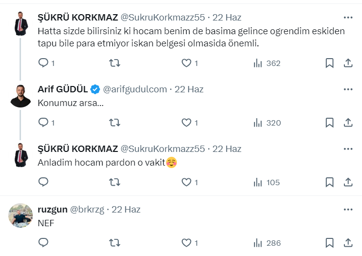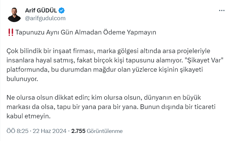 Arsa ve arazinin yıldızı giderek parlarken, Toprak Yatırımcısı ve talepbul'un Yönetim Kurulu Başkanı Arif Güdül resmi X hesabı https://x.com/arifgudulcom üzerinden yaptığı arsa yatırımcılarını uyararak, "Tapunuzu aynı gün almadan ödeme yapmayın" dedi.