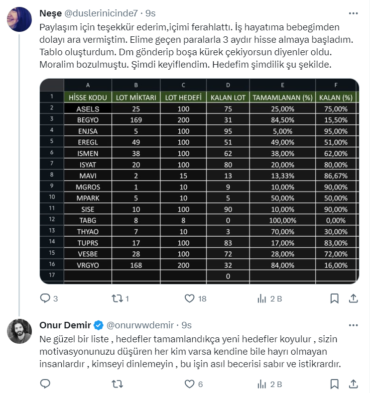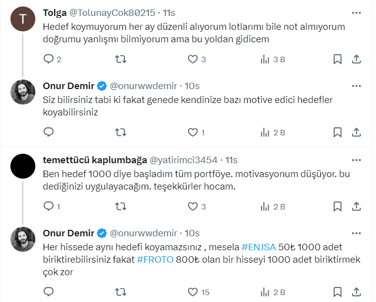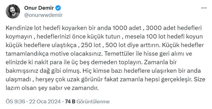 Uzun vade hisse senedi yatırımcısı Onur Demir resmi sosyal medya hesabı https://twitter.com/onurwwdemir üzerinden yaptığı paylaşımda "Kendinize lot hedefi koyarken bir anda 1000 adet, 3000 adet hedefleri koymayın , hedeflerinizi önce küçük tutun , mesela 100 lot hedefi koyun küçük hedeflere ulaştıkça 250 lot, 500 lot diye artırın." ifadelerini kullandı.