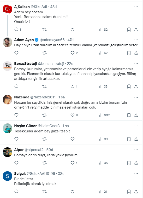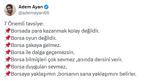 Peki borsa yatırımında neye dikkat edilmeli? İşte Borsa eğitmeni Adem Ayan'ın o paylaşımı ve takipçilerinden gelen yorumlar....