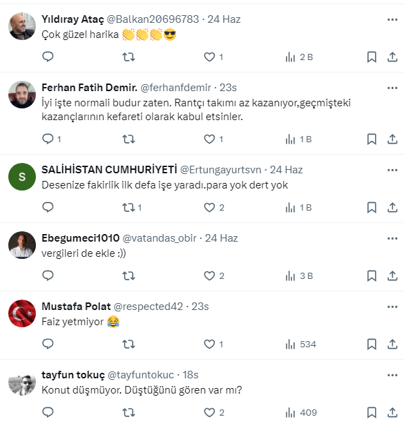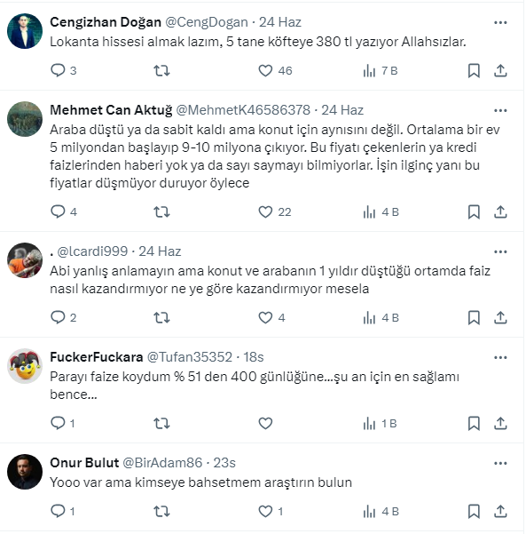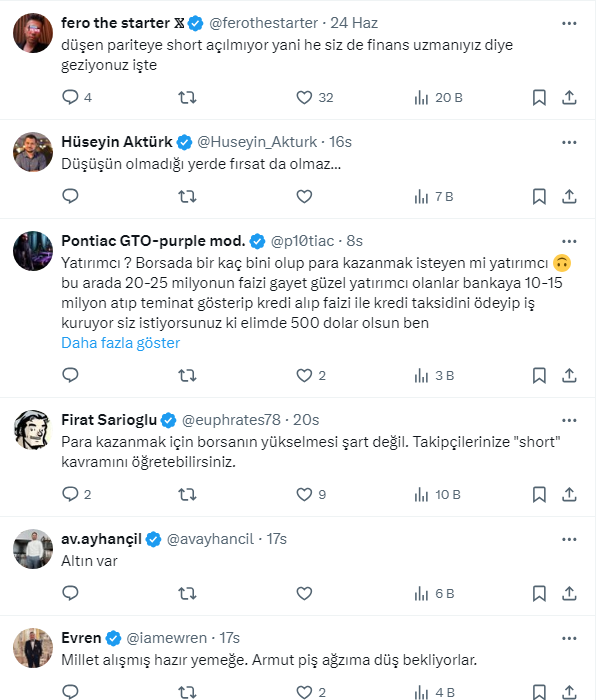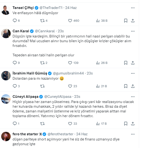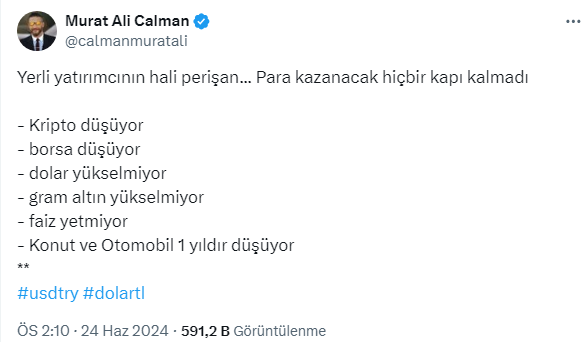 Yatırımcılar ellerindeki nirikmiş paralarını altın, dolar, kripto para, faiz, araba ve ev gibi yatırım araçlarıyla değerlendiriyor. Son zamanlarda piyasalarda harekeketli anlar yaşanıyor. Kripto fenomeni Murat Ali Calman, piyasaları değerlendirerek yerli yatırımcıların perişan halde olduğunu söyledi. Calman sosyal medya hesabı X' ten yatırım araçlarını tek tek sıralayarak yatırımcıların halini bir kez daha gözler önüne serdi. İşte o paylaşım ve gelen yorumlar...