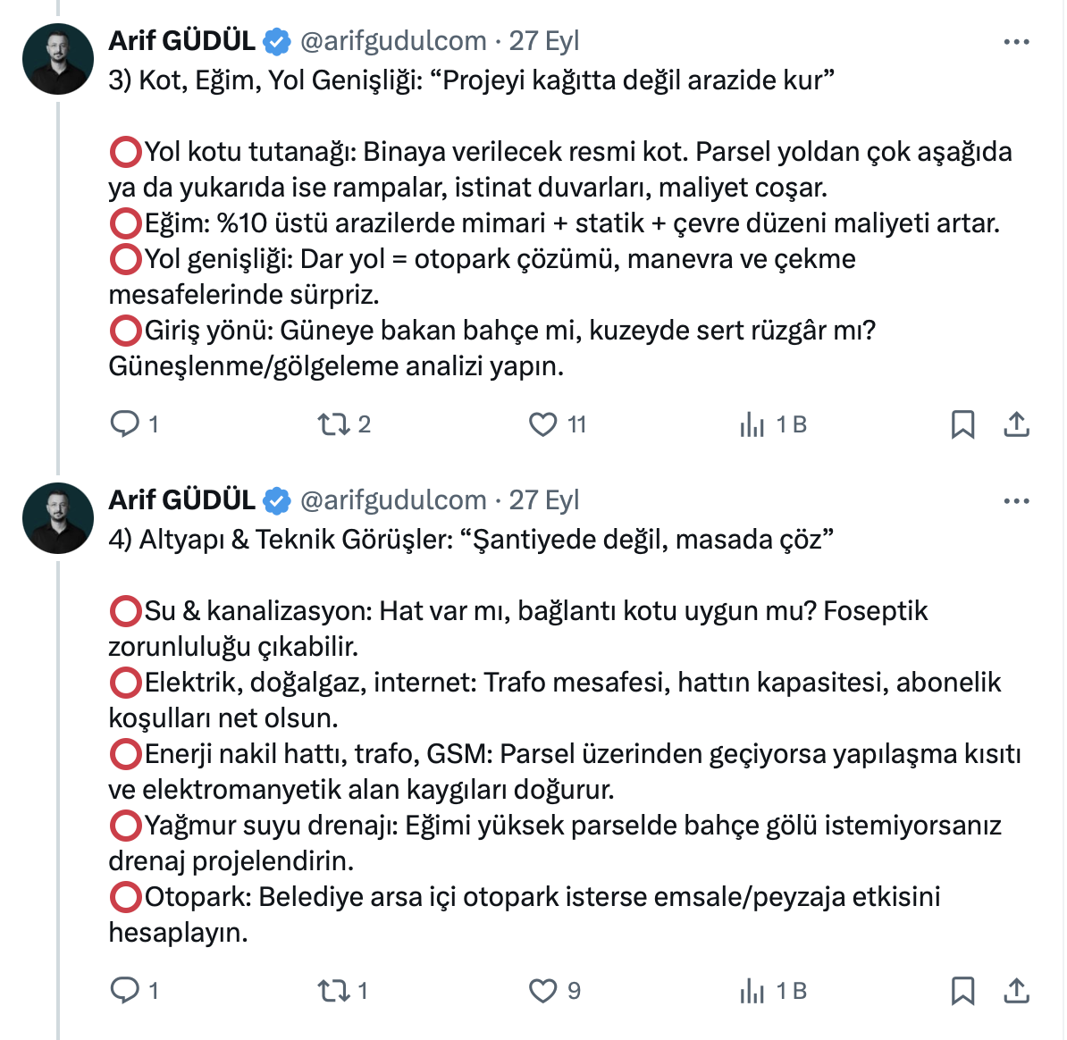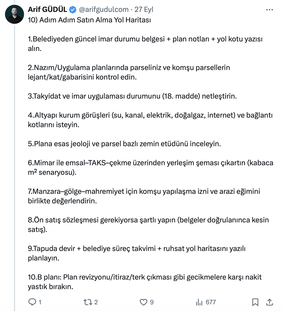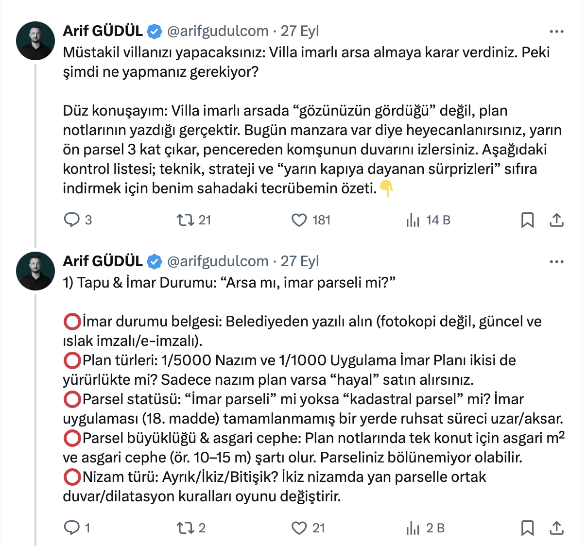 Toprak Yatırımcısı ve talepbul'un Yönetim Kurulu Başkanı Arif Güdül resmi sosyal medya hesabı üzerinden müstakil villa yaptırmak isteyenlerin ne yapmaları gerektiğini paylaştı.