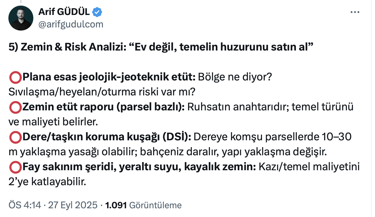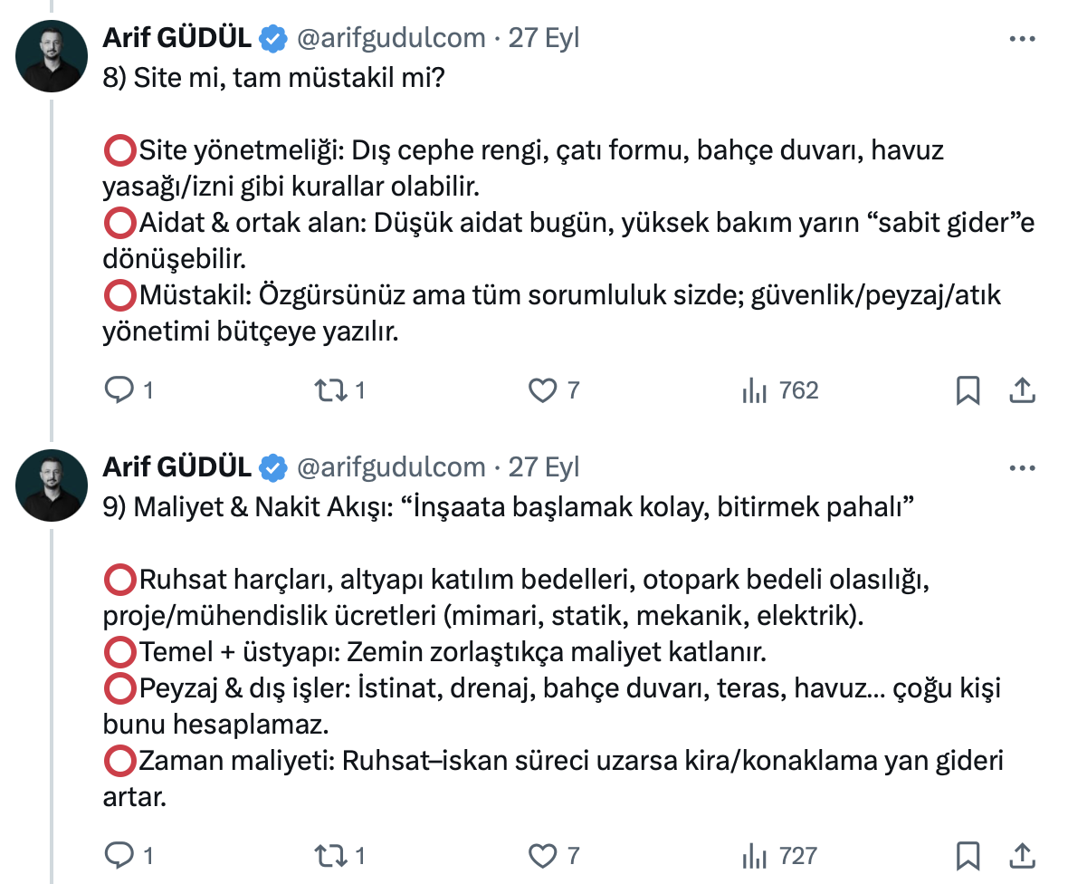 İnşaat maliyetlerindeki artış devam ederken, Toprak Yatırımcısı ve talepbul'un Yönetim Kurulu Başkanı Arif Güdül resmi X hesabı https://x.com/arifgudulcom üzerinden çok önemli bir paylaşım yaparak, müstakil villa yaptırmak isteyenlerin ne yapmaları gerektiğini paylaştı.