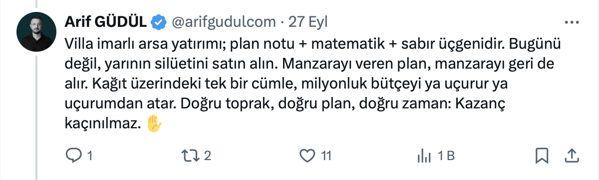 Toprak Yatırımcısı ve talepbul'un Yönetim Kurulu Başkanı Arif Güdül’ün söz konusu paylaşımı şu şekilde: