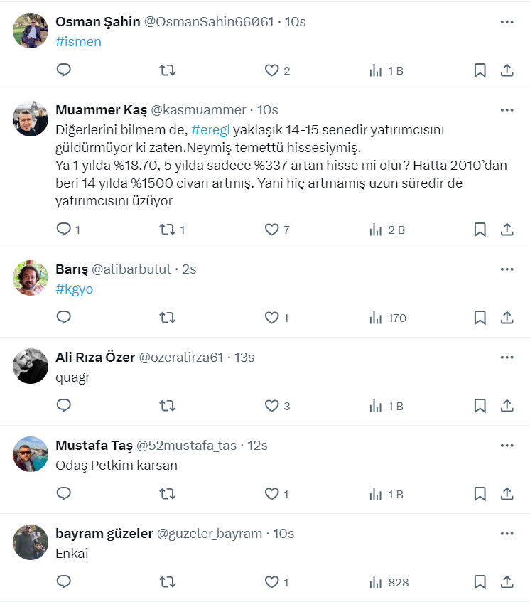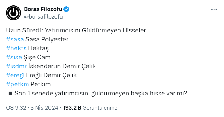 Yatırımcıların gündeminden düşmeyen borsa ile ilgili olarak yaptığı paylaşımlarla dikkat çeken 238,3 bin takipçili Borsa Filozofu resmi X hesabı https://twitter.com/borsafilozofu üzerinden uzun süredir yatırımcısını güldürmeyen hisseleri paylaştı.