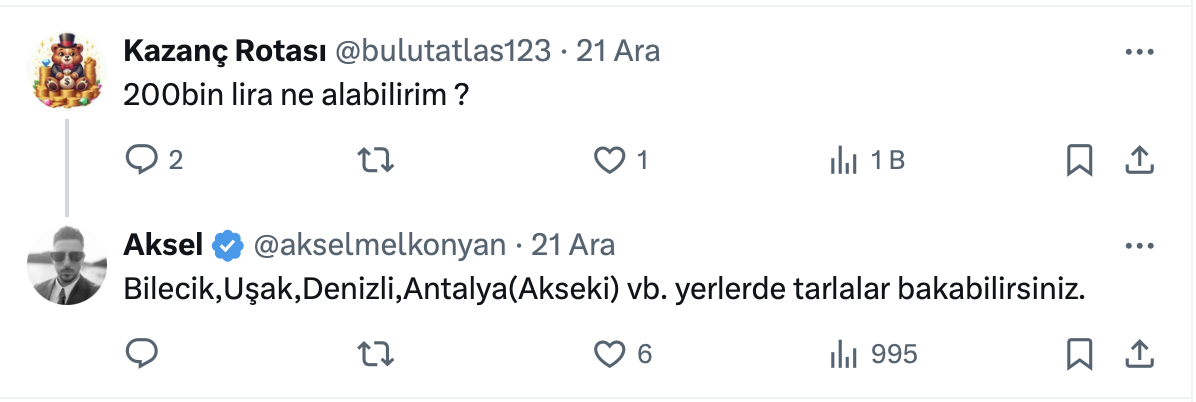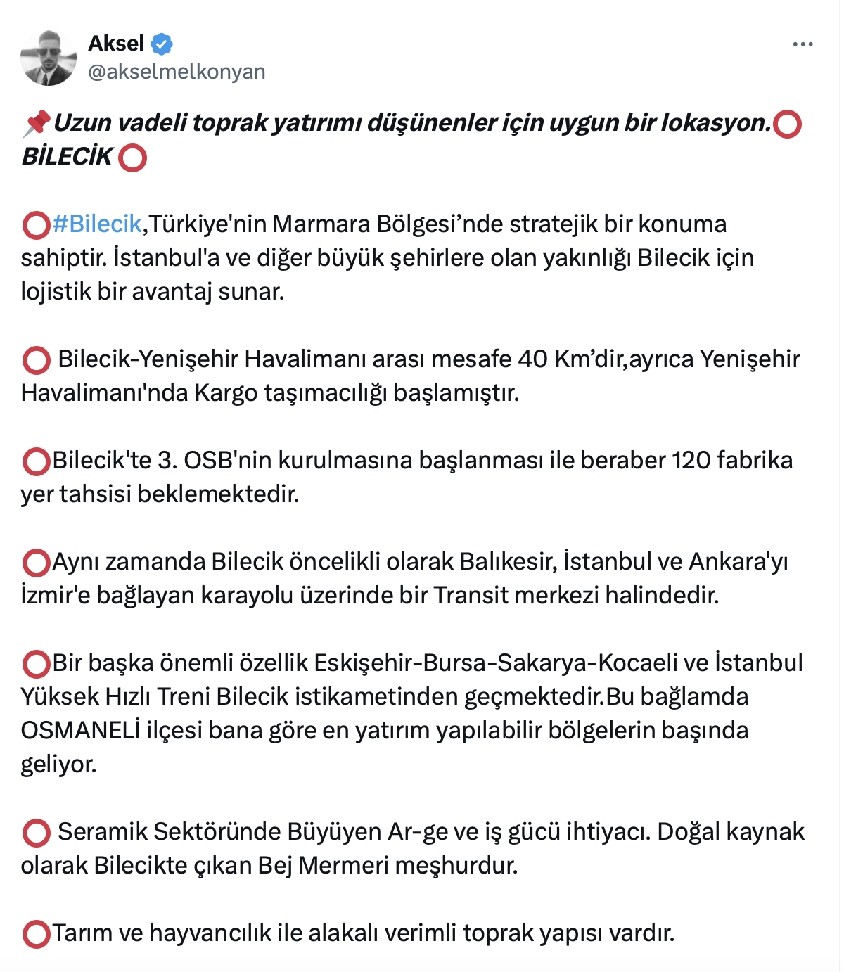 Toprak yatırımları ile ilgili olarak yaptığı paylaşımlarla yatırımcıların en çok takip ettiği isimler arasına adını yazdıran Toprak Yatırımcısı ve Danışmanı Aksel Melkonyan resmi X hesabı https://x.com/akselmelkonyan üzerinden yine çok konuşulacak bir paylaşım yaptı.