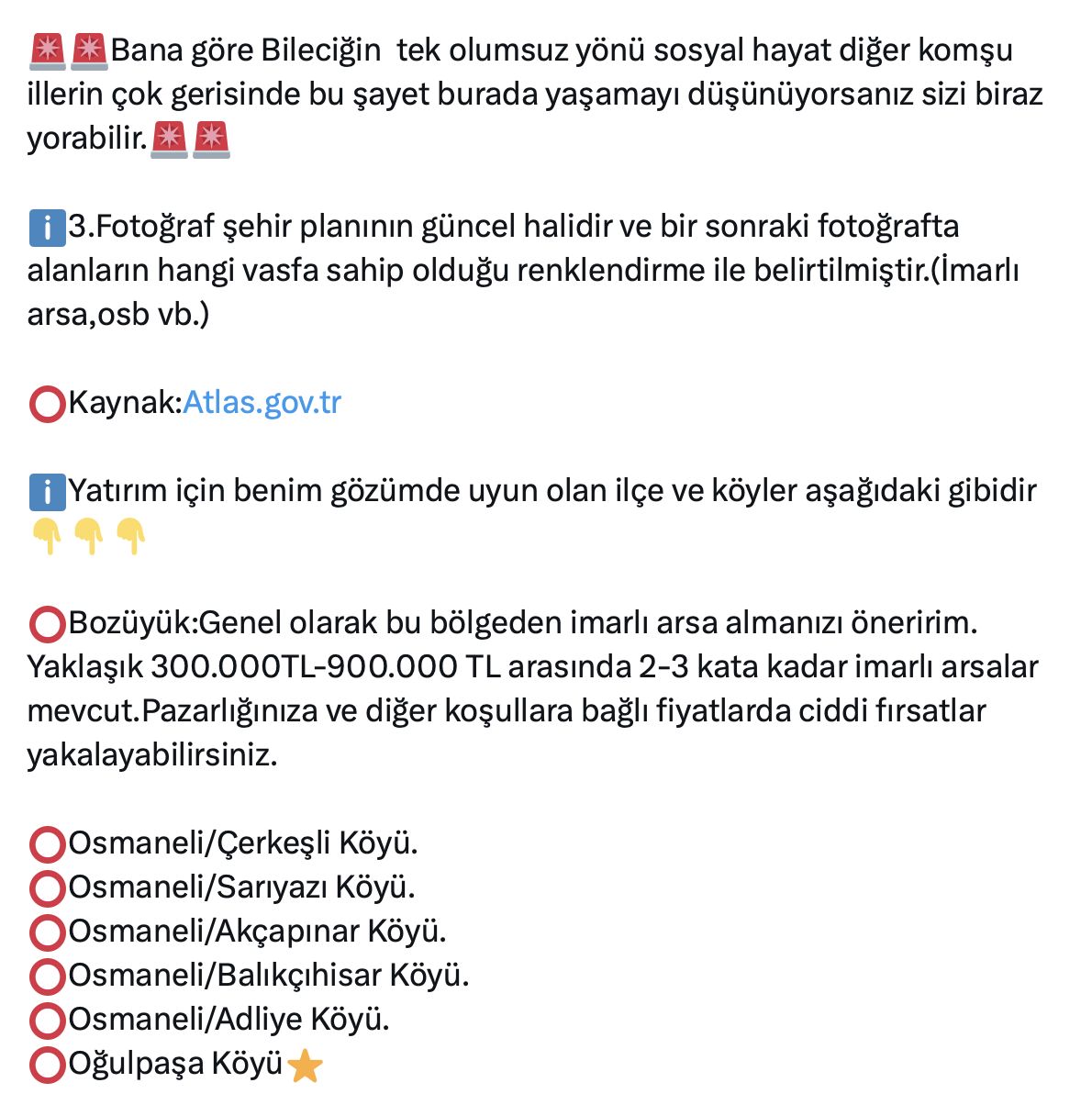 -Bozüyük: Genel olarak bu bölgeden imarlı arsa almanızı öneririm.