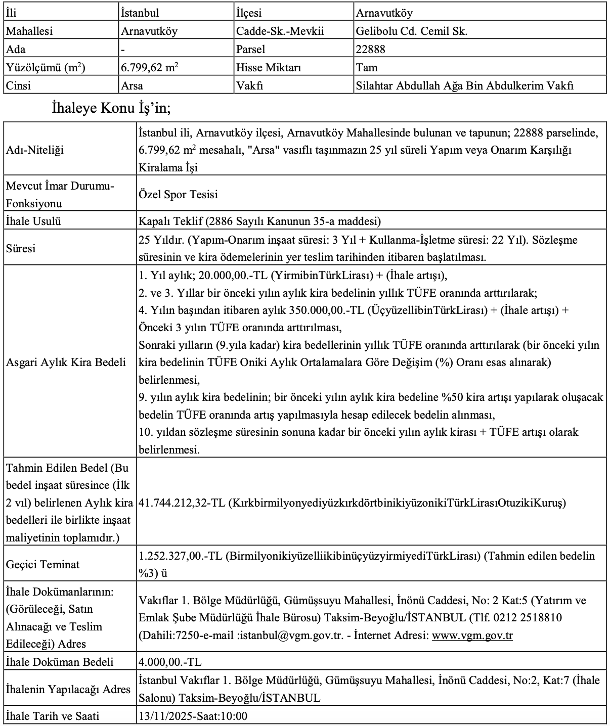 İstanbul Vakıflar 1. Bölge Müdürlüğü, İstanbul Arnavutköy’de özel spor tesisi yapımı ve işletilmesi için ihaleye çıkıyor. Söz konusu ihale, Yapım veya Onarım Karşılığı Kiralama kapsamında ve 2886 sayılı Devlet İhale Kanunu çerçevesinde gerçekleştirilecek.