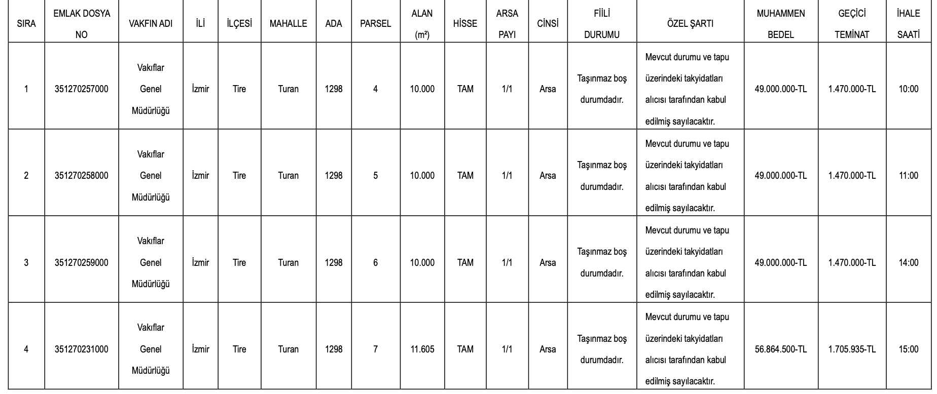 İzmir Vakıflar Bölge Müdürlüğü, İzmir Tire’de yer alan dört adet arsayı satışa çıkardı. Turan Mahallesi’nde yer alan arsaların muhammen bedelleri 49 milyon TL’den başlıyor.