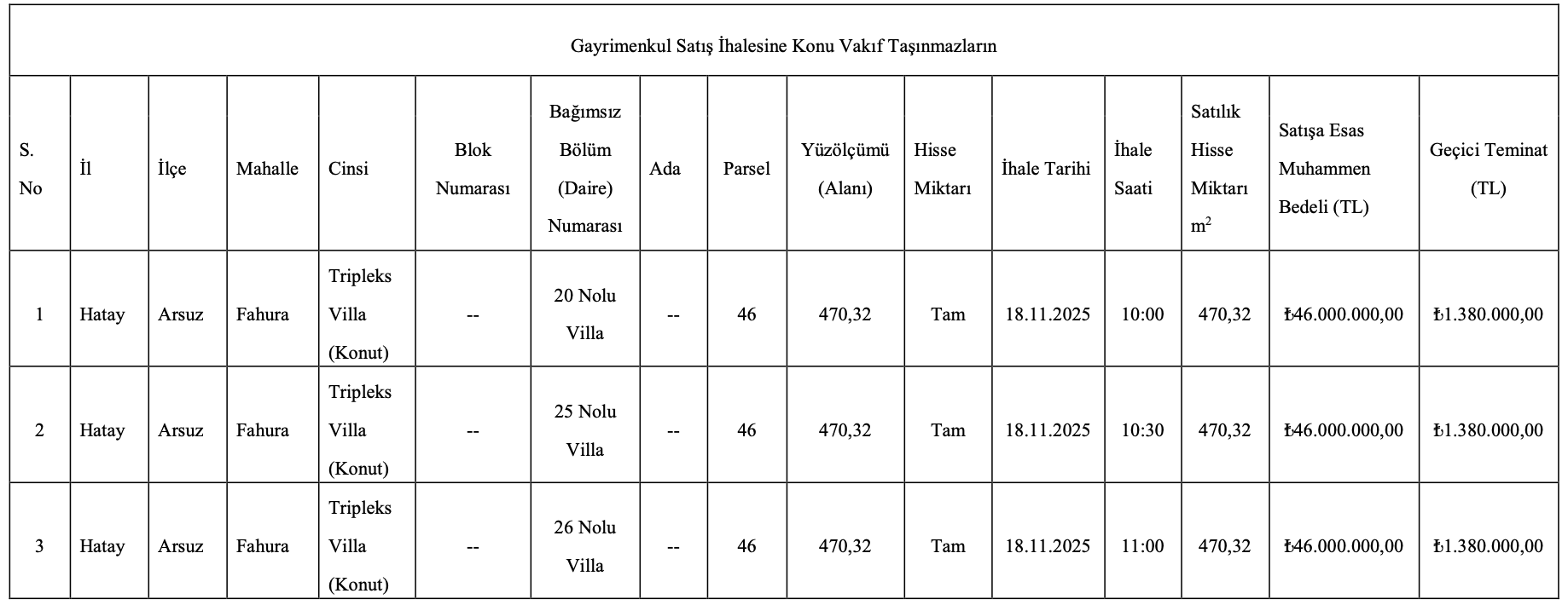 Hatay Vakıflar Bölge Müdürlüğü, Hatay Arsuz’da yer alan 3 adet villayı satışa çıkardı. Villaların satış ihalesi 18 Kasım 2025 tarihinde yapılacak.