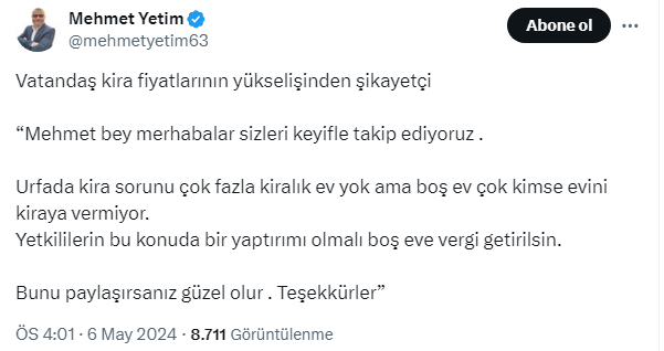 Vatandaş kira fiyatlarının yükselişinden şikayetçi “Mehmet bey merhabalar sizleri keyifle takip ediyoruz . Urfada kira sorunu çok fazla kiralık ev yok ama boş ev çok kimse evini kiraya vermiyor. Yetkililerin bu konuda bir yaptırımı olmalı boş eve vergi getirilsin. Bunu paylaşırsanız güzel olur . Teşekkürler”