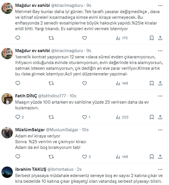 Kira bedelleri ülke genelinde büyük sorun haline gelmeye başladı. Yükselen kira bedelleri altında ezilen vatandaş yetklilerden bu konutya çözüm getirilmesini istedi. Gazeteci Mehmet Yetim, vatandaşın kira sorununu gündeme getirdi. Yetim'e bilgi veren halk, Şanlıurfada'ki kira bedellerine değinerek, kiralık evin olmadığını boş evini de kiraya vermek istemediklerini söyledi. Yetim konuyu sosyal meyda hesabı X'ten paylaştı. İşte o paylaşımve gelen yorumlar...