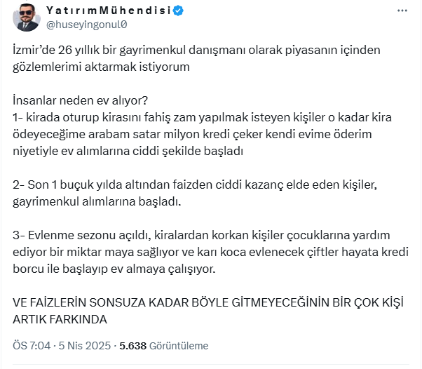 İzmir'de 26 yıldır Gayrimenul Danışmanlığı yapan Hüseyin Gönün konut piyasasındaki satışların artmasının altında yatan nedenleri açıkladı.