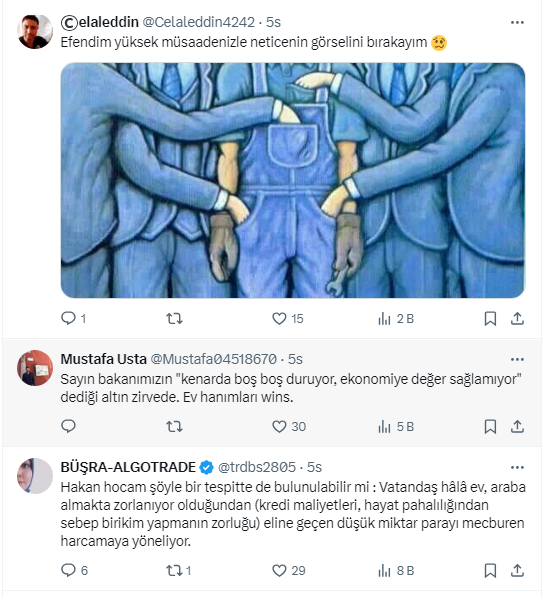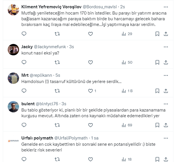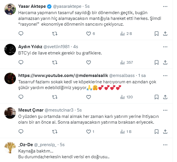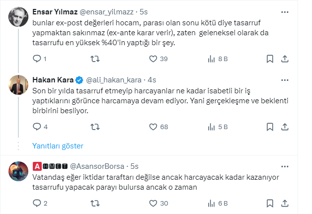 Vatandaşlar Kara’nın paylaşımına yaptığı yorumlarda, “Harcama yapmak tasarruf sayılıyor bugün alamazsam yarın hiç alamayacağım mantığı hakim” dedi.