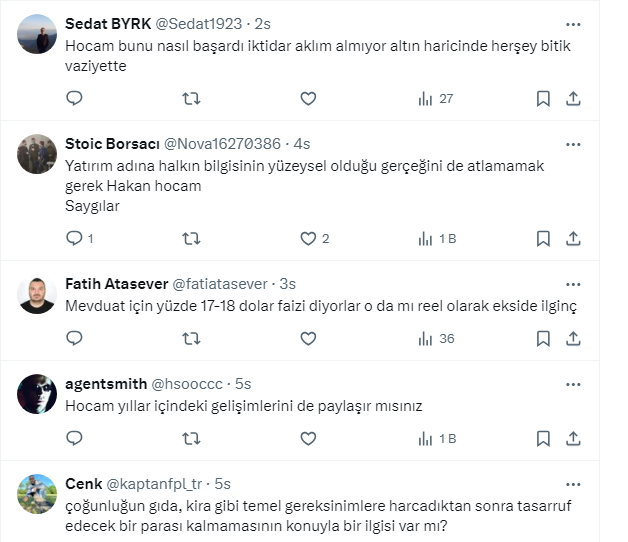 Bilkent Üniversitesi Öğretim Üyesi, TCMB eski Başekonomisti Prof. Dr. Ali Hakan Kara, https://x.com/ali_hakan_kara X sosyal medya hesabından yaptığı paylaşımda, “Vatandaş neden tasarruf etmiyor da eline geçeni harcıyor” diye sordu. Hakan Kara kendi sorusuna, altın dışında diğer tüm yatırım araçlarının reel bazda kaybettirdiğini gösteren bir grafikle cevapladı. Vatandaş neden tasarruf etmiyor da eline geçeni harcıyor” diye soranlara bu grafiği göstermelerini istedi.