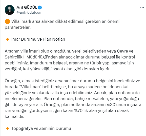 Toprak yatırımcısı Arif Güdül, villa imarlı arsa alırken dikkat edilmesi gereken en önemli parametreleri sosyal medyadan madde madde açıkladı. Peki Villa imarlı arsa alırken neye dikkat edilmeli?