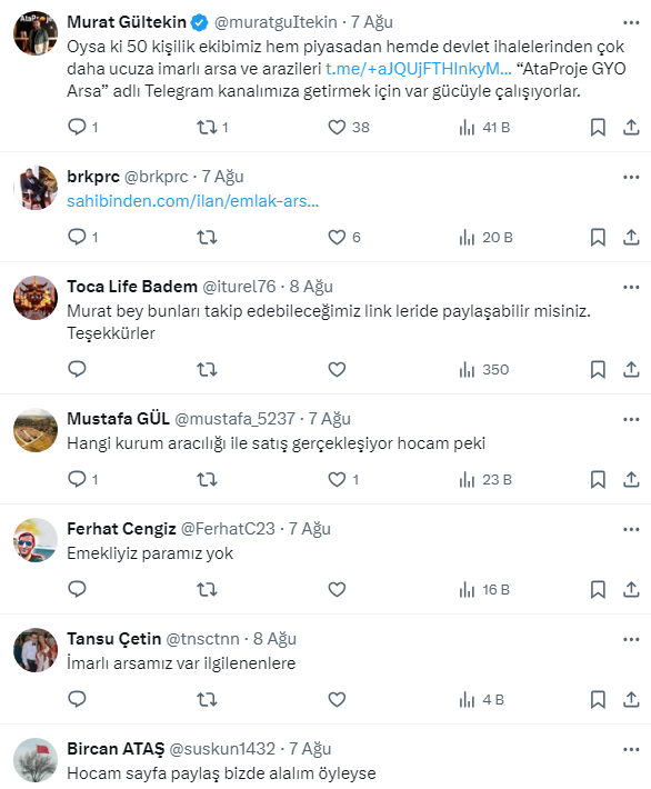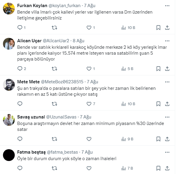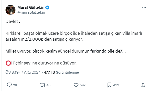 Gültekin, ihaleyle arsa ve arazi satışlarına dikkat çekerek 'millet uyuyor' dedi. Gültekin, başta Kırklareli olmak üzere metrekaresi 2 bin liradan satılan arsaların olduğunu fakat kimsenin bu durumdan haberi bile olmadığını söyledi. Sosyal medya hesab X'ten ihaleyle arsa satışlarına değinen Gültekin ''Hiç birşey ne duruyor, ne düşüyor'' dedi. İşte Gültekin'in o paylaşımı ve gelen yorumlar...
