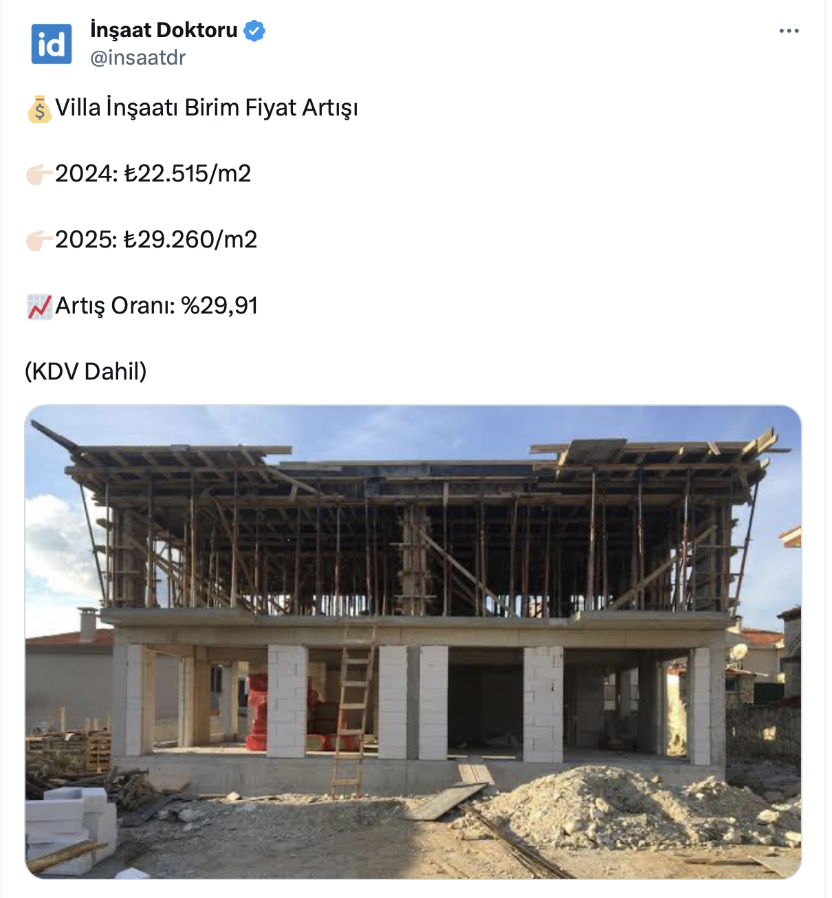 İnşaat maliyetlerindeki artış hız kesmeden devam ederken, 49,9 bin takipçili İnşaat Doktoru resmi X hesabı https://twitter.com/insaatdr üzerinden yaptığı paylaşımda villa inşaatı birim fiyat artışını açıkladı.