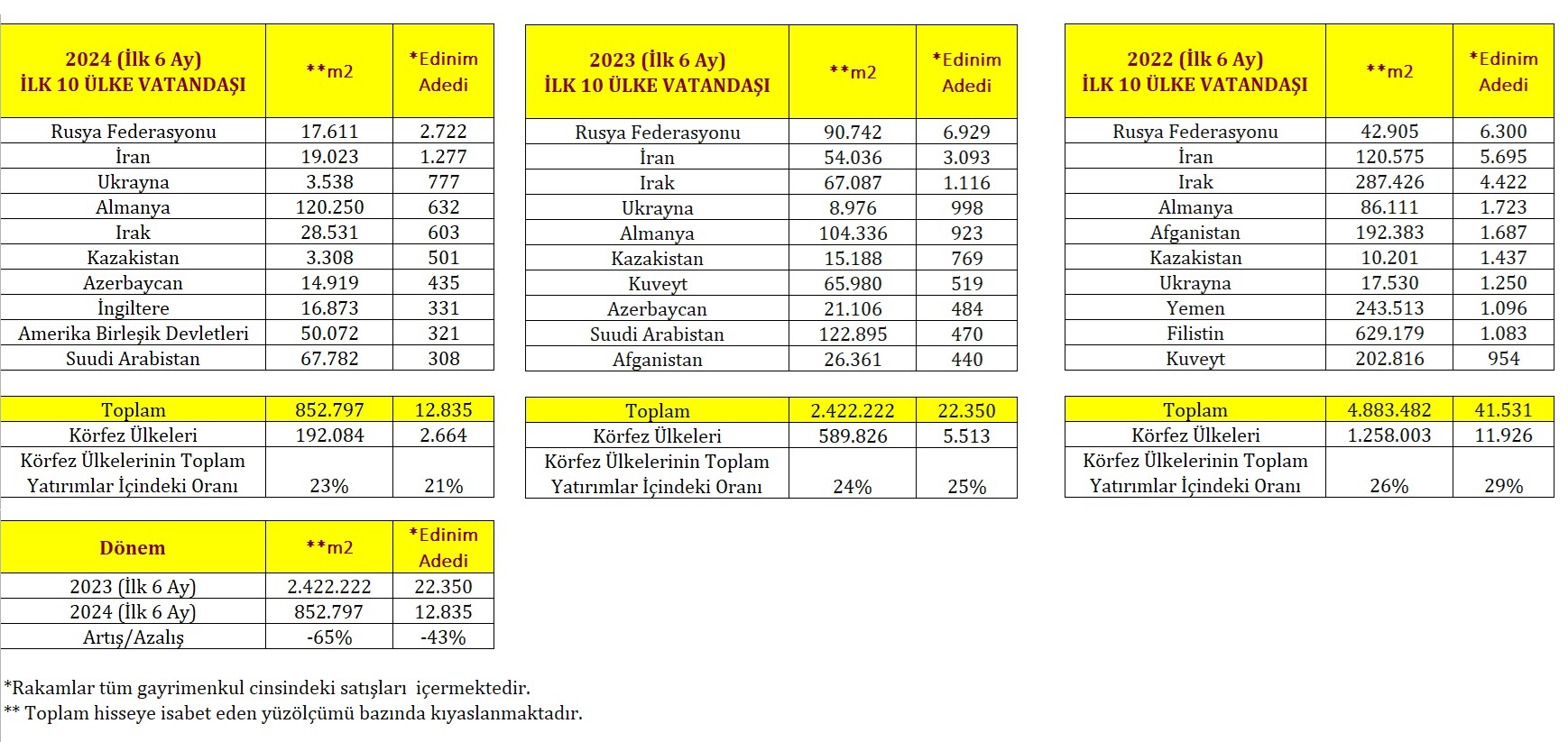 Ayrıca, toplam yabancı yatırımlarının içinde Körfez ülkelerinin durumunu değerlendiren EVA Gayrimenkul Değerleme, 2023 yılı ilk 6 ayında metrekare bazında toplam yabancı yatırım içinde payı yüzde 23 olan Körfez ülkelerinin 2024 senenin aynı dönemindeki payının yüzde 21’e düştüğünü ortaya koyuyor.