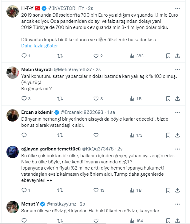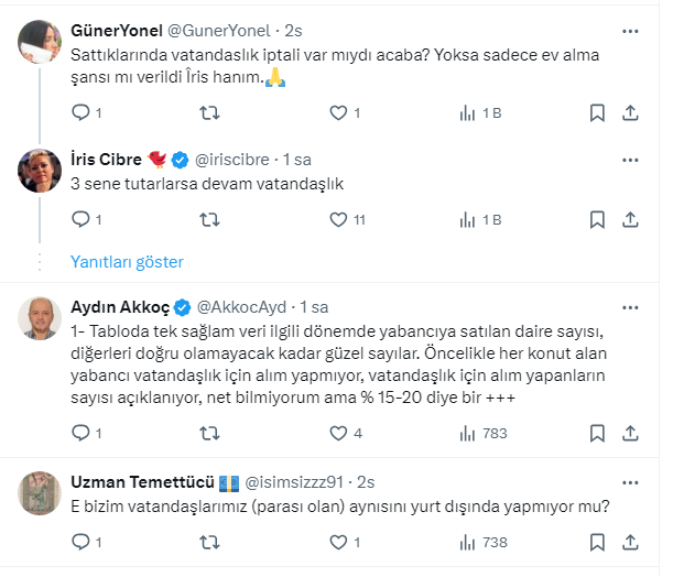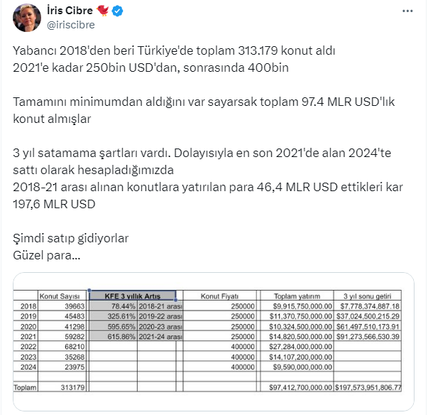 Ekonomist İris Cibre, sosyal medya hesabından yabancıların konutlarını satmaya başladığını söyleyerek 'Şimdi satıp gidiyorlar, güzel para'' diyerek şu hesaplamayı yaptı.
