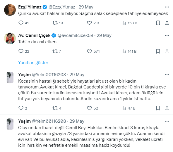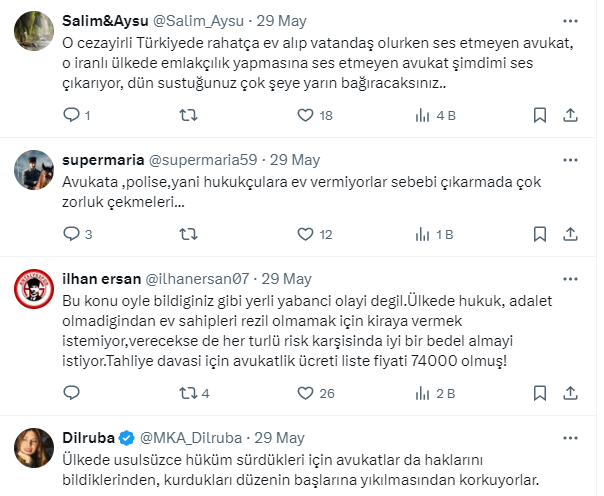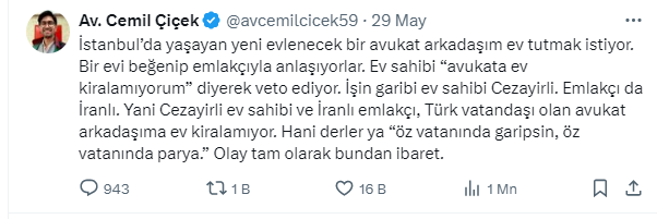 Avukat Cemil Çiçek, sosyal medya hesabından, yabancı ev sahibi ve emlakçının yaptıklarını açıkladı. Çiçek, bir arkadaşının ev kiralamak istediğini ve görüştüğü emlakçının Cezayirli, ev sahibinin ise İranlı olduğunu öğrendi fakat ev sahibi evini kiraya vermek istemediğini söyledi.
