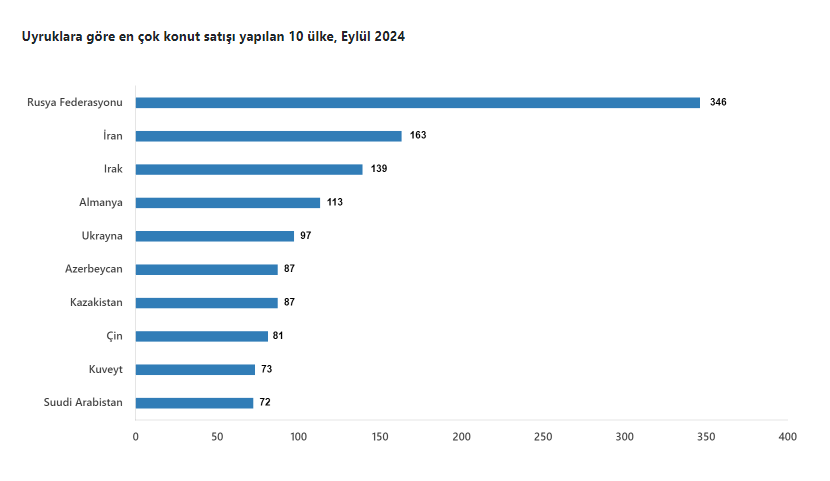 Eylül ayında ülke uyruklarına göre en fazla konut satışı sırasıyla 346 ile Rusya Federasyonu, 163 ile İran ve 139 ile Irak vatandaşlarına yapıldı.