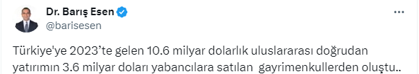 Gazeteci Barış Esen X Sosyal https://twitter.com/barisesen X sosyal medya hesabından yaptığı paylaşımda, “Türkiye'ye 2023’te gelen 10.6 milyar dolarlık uluslararası doğrudan yatırımın 3.6 milyar doları yabancılara satılan gayrimenkullerden oluştu” dedi.. Konut krizine çözüm arandığı dönemde bu rakamların gelmesi takipçilerin tepkisine neden oldu. Açıklanan rakamlara göre Yabancılardan para en çok gayrimenkule geldi.