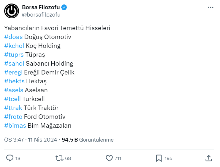 238,7 bin takipçili Borsa Filozofu resmi X hesabı https://twitter.com/borsafilozofu üzerinden Yabancıların Favori Temettü Hisselerini paylaştı.