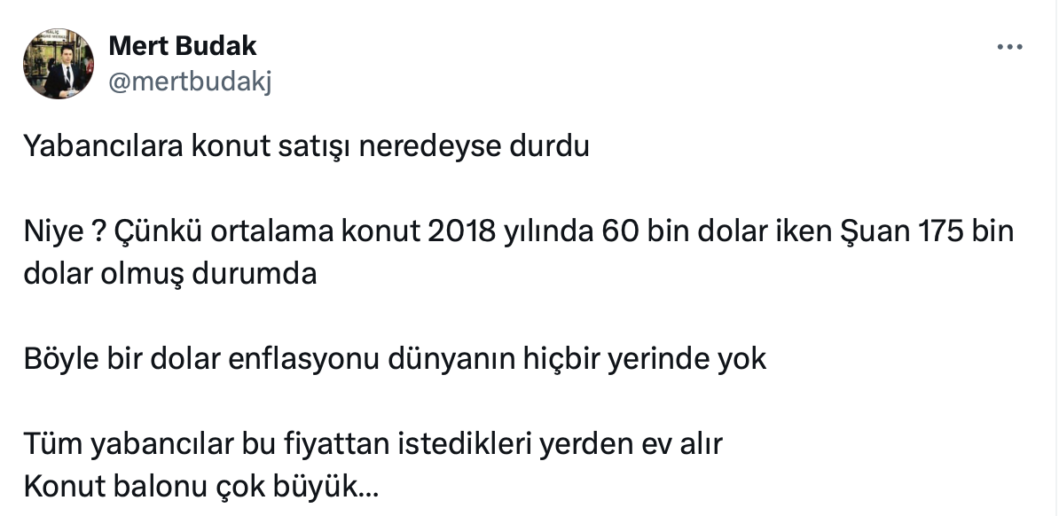 Mert Budak paylaşımında “Ortalama konut 2018 yılında 60 bin dolar iken Şu an 175 bin dolar olmuş durumda Böyle bir dolar enflasyonu dünyanın hiçbir yerinde yok Tüm yabancılar bu fiyattan istedikleri yerden ev alır Konut balonu çok büyük…” ifadelerini kullandı.
