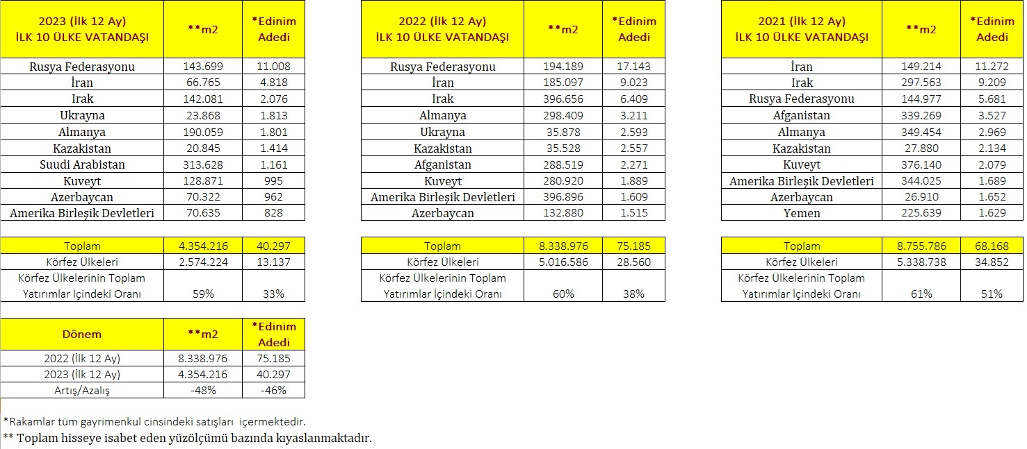 2023 yılı 12 aylık veriler itibariyle Türkiye genelinde yabancılara yapılan toplam gayrimenkul satış adetinde ise geçtiğimiz sene de ilk sırada yer alan Rusya Federasyonu ilk sırayı aldı. Rusya Federasyonu’nu İran, Irak, Ukrayna, Almanya, Kazakistan, Suudi Arabistan, Kuveyt, Azerbaycan ve Amerika Birleşik Devletleri takip etti.