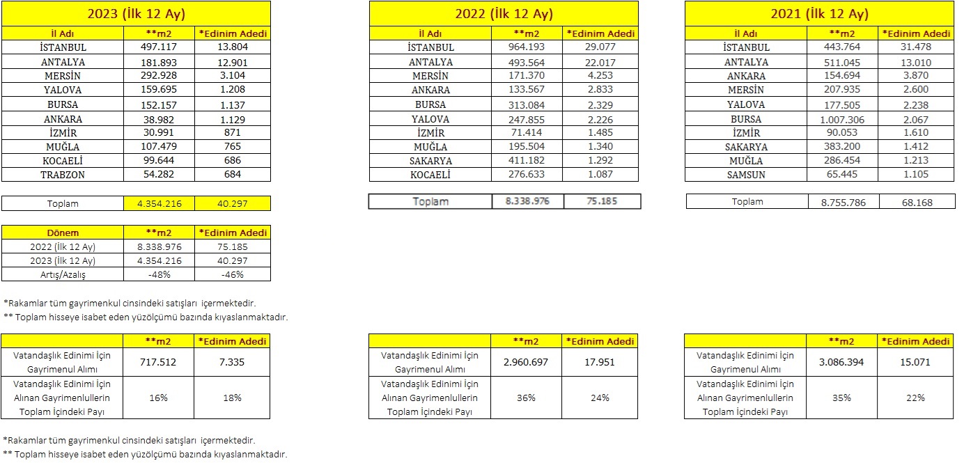 2023 yılı 12 aylık veriler itibariyle yabancıların gayrimenkul yatırımlarında en çok tercih ettiği il İstanbul olurken, İstanbul ilini sırası ile Mersin, Antalya, Yalova, Bursa, Muğla, Kocaeli, Trabzon, Ankara ve İzmir izledi.