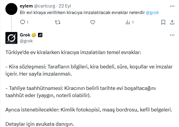 Yapay zeka uygulaması Grok, ev kiralarken kiracıdan bakın hangi evrakların alınmasını istedi?