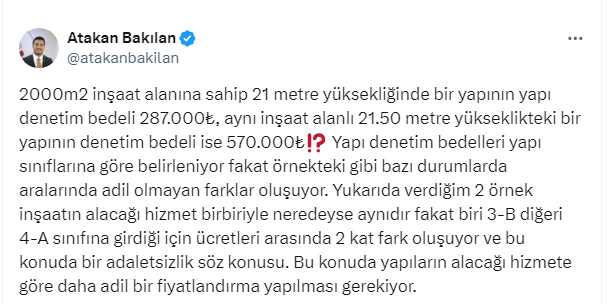 Yapı denetim bedellerinde fiyatlandırmanın adil şekilde yapılmadığını belirten, inşaat mühendisi Atakan Bakılan 50 cm yükseklik farkı için neredeyse iki kat bedel ödendiğini söyledi. Bakılan, adil bir fiyatlandırma çağrısında bulundu.